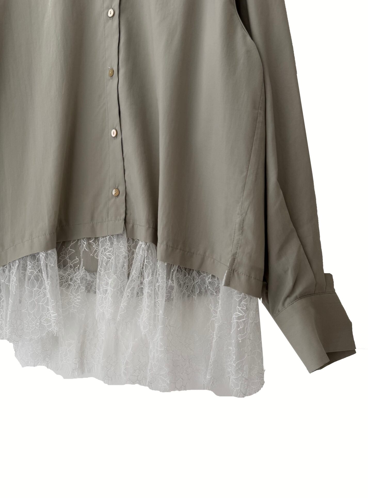 繊細なレースを裾に施したスタンドカラーのシャツ。