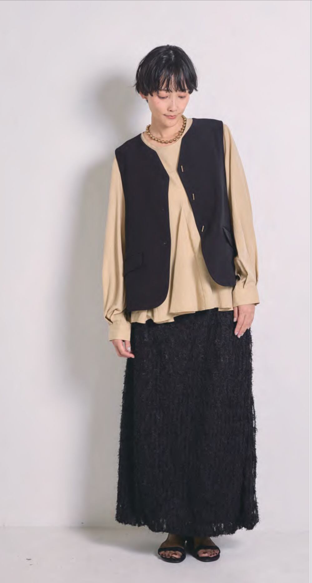 素材感の落ち感を利用し、フレアシルエットで女性らしさをプラスした印象に仕上げました。