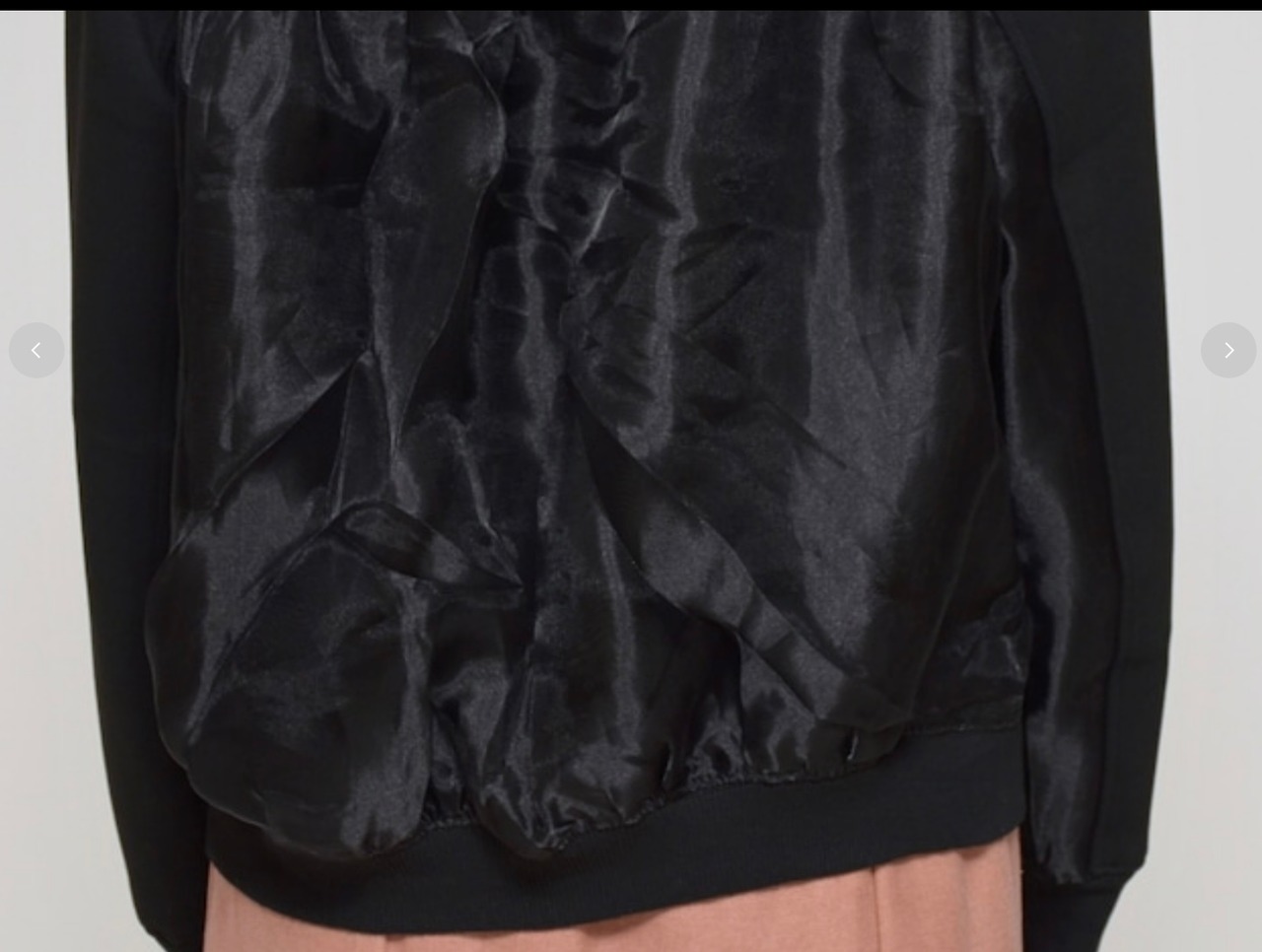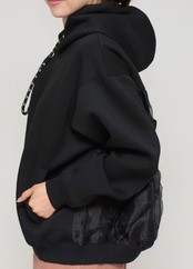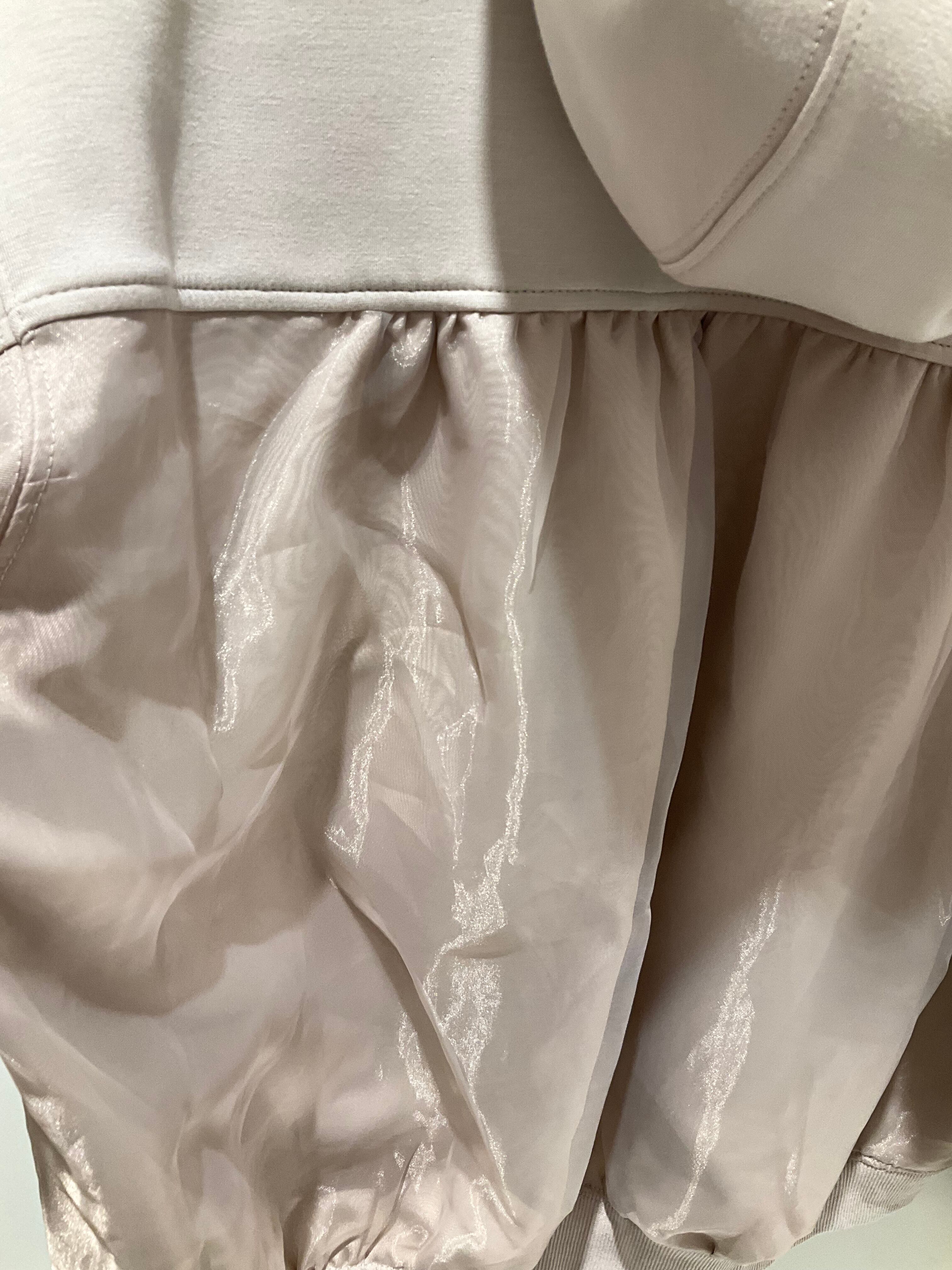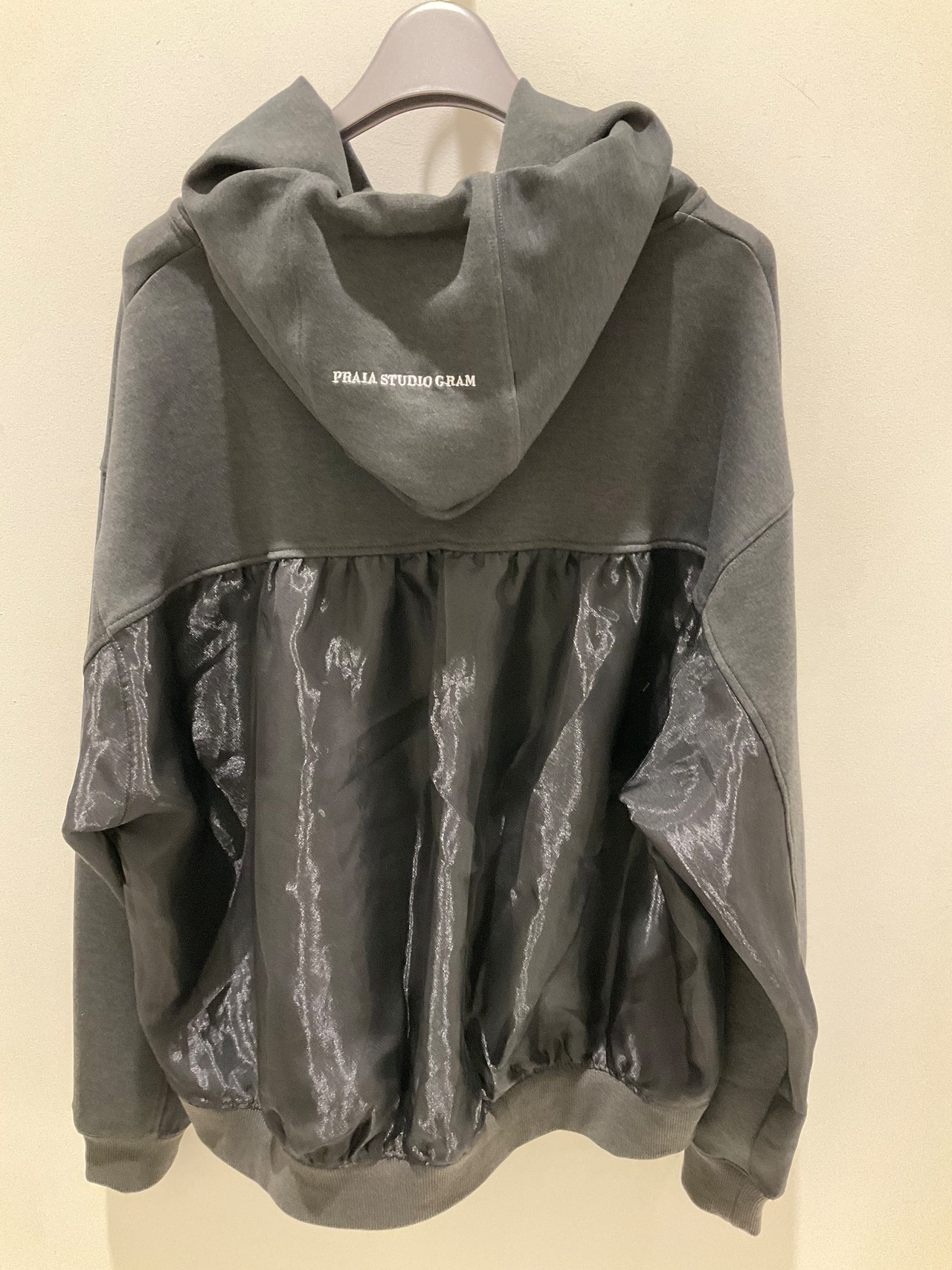 後ろ身頃を軽やかなオーガンジー素材に切り替えることで、重たくなりがちなパーカーに抜け感をプラス。