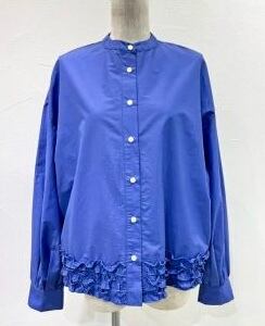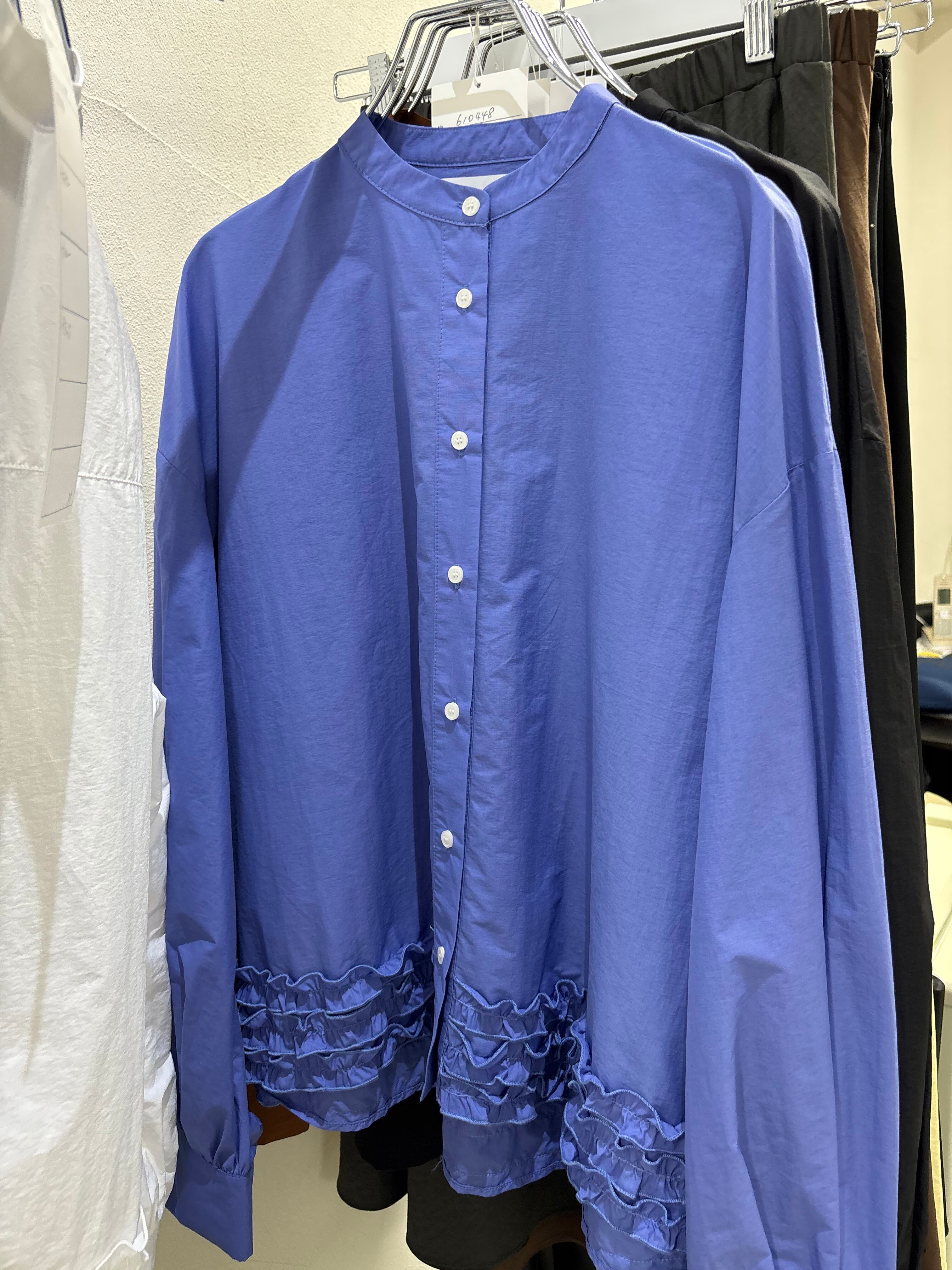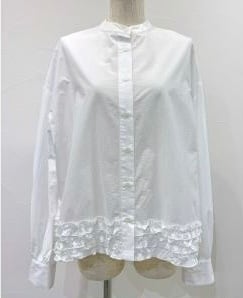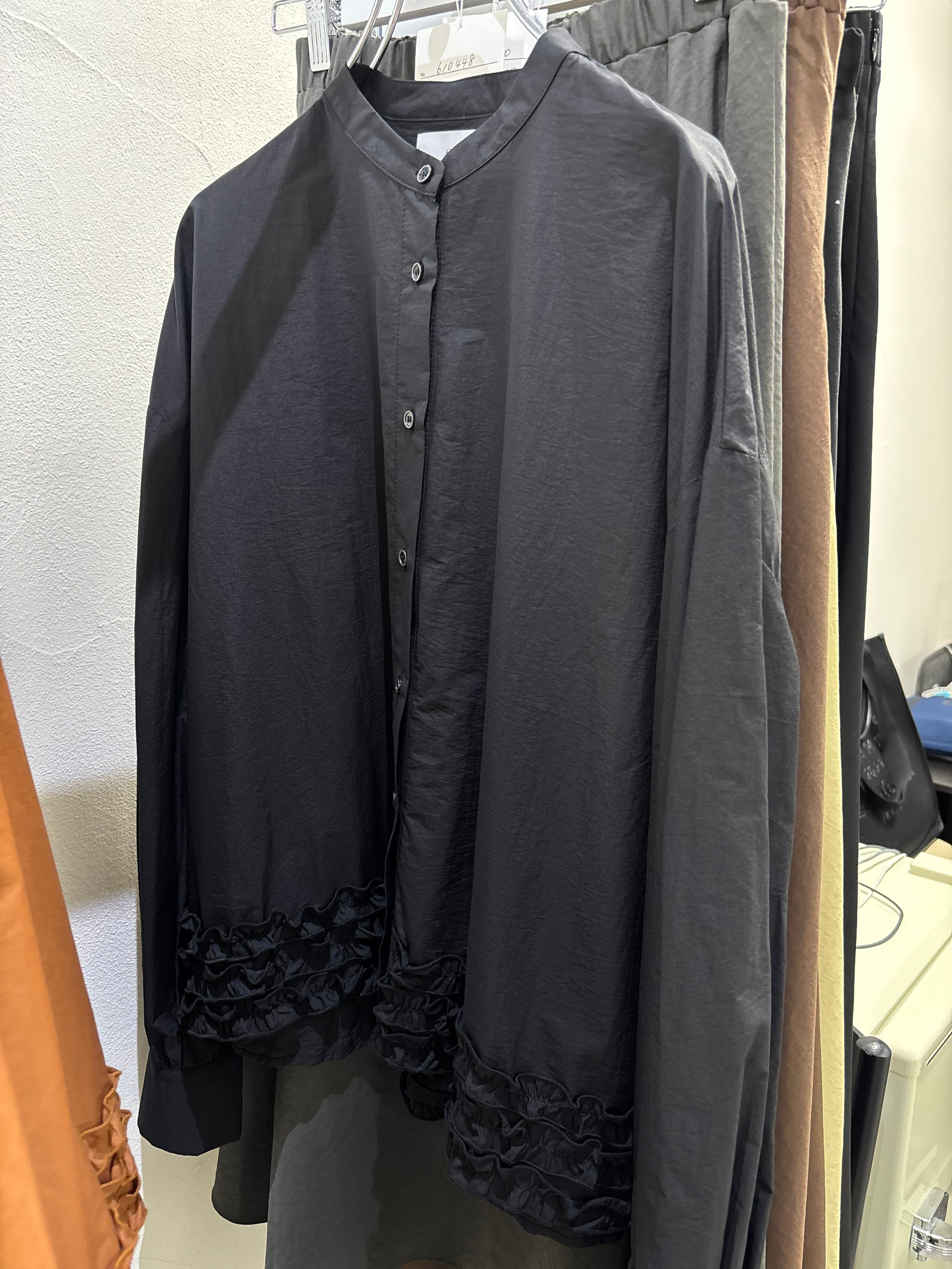 裾がフリルデザインのバンドカラーシャツ。1枚でもレイヤードスタイルでもコーディネートできて、大活躍してくれます!