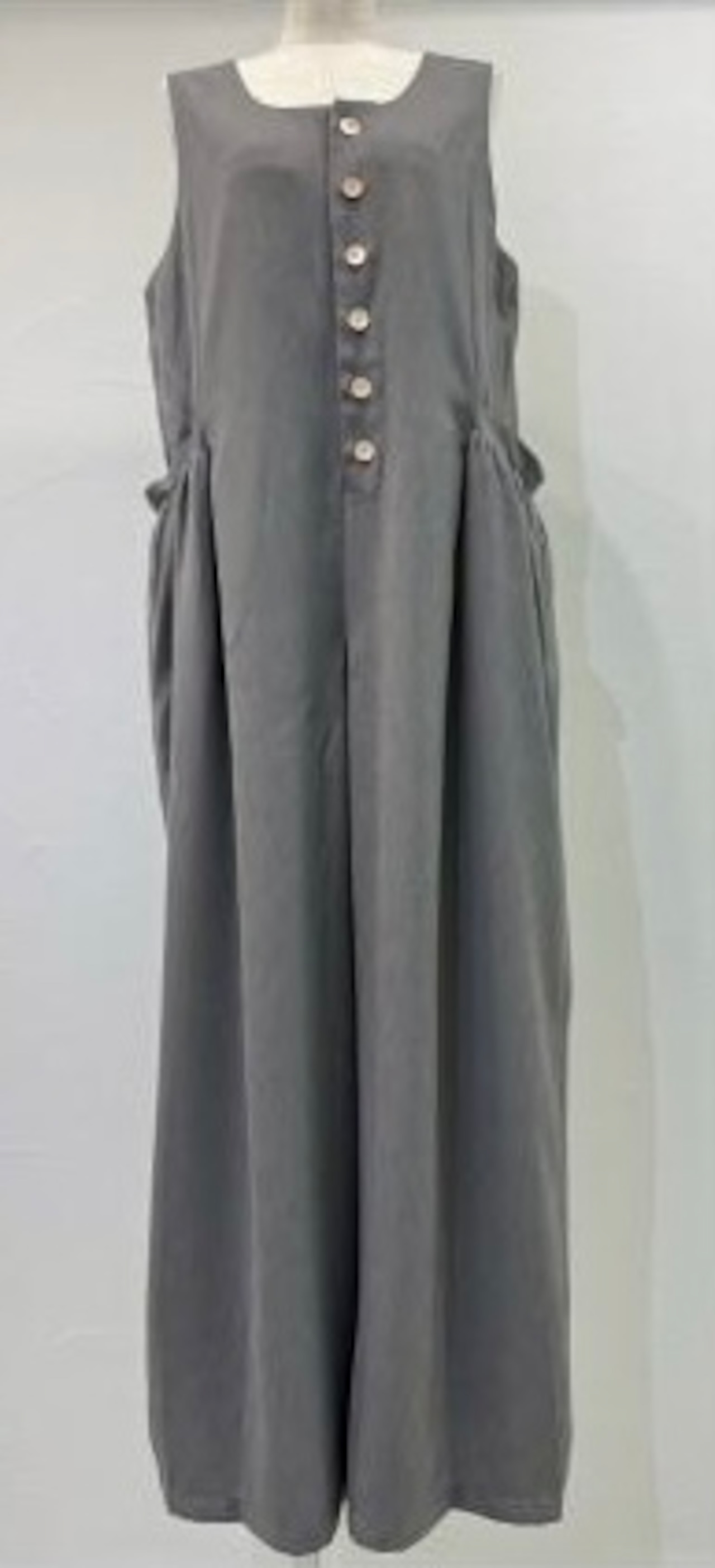 ギャザー入りポケットがかわいいサロペット。フロントのボタンも◎