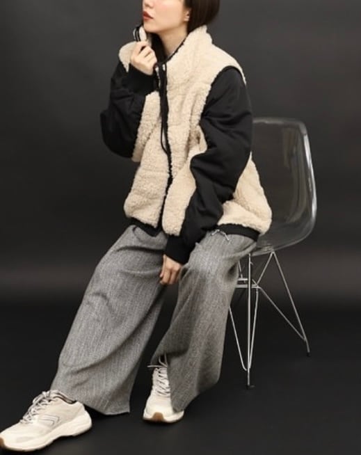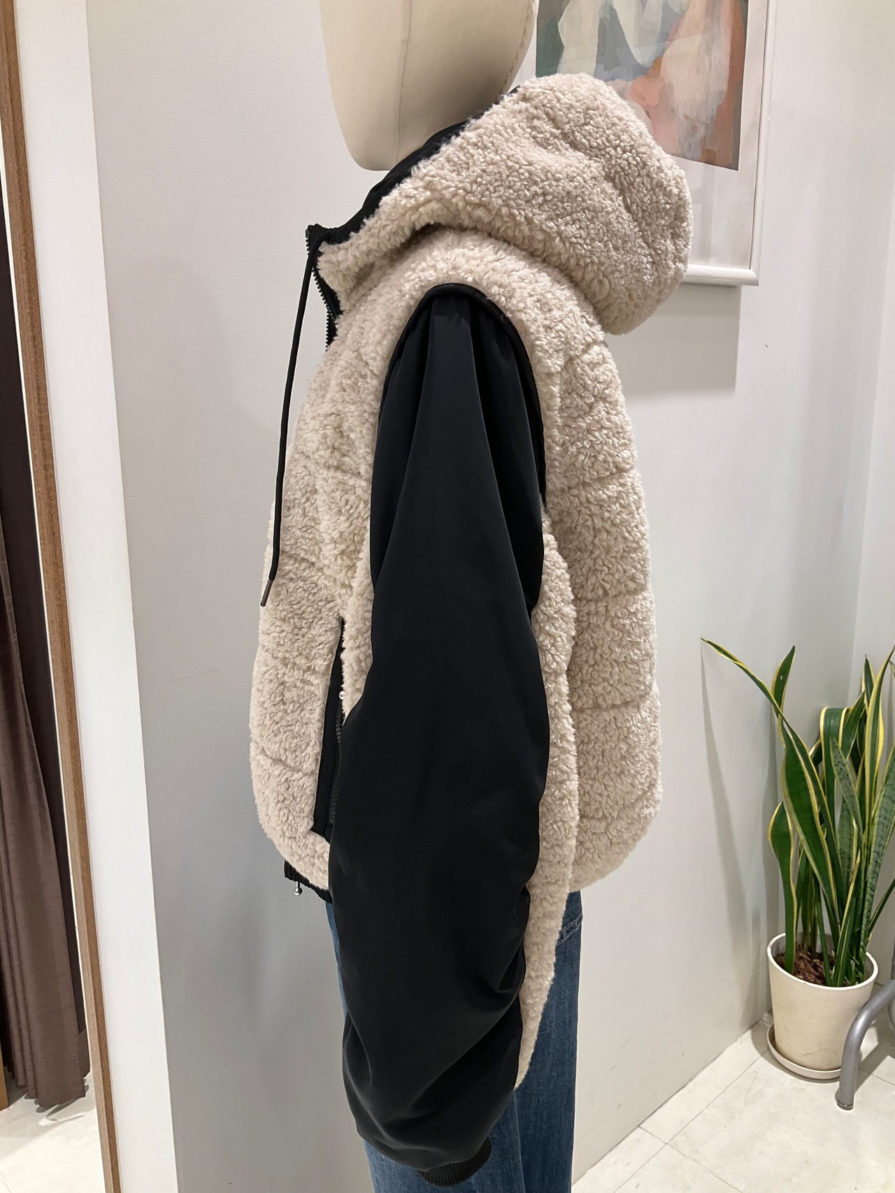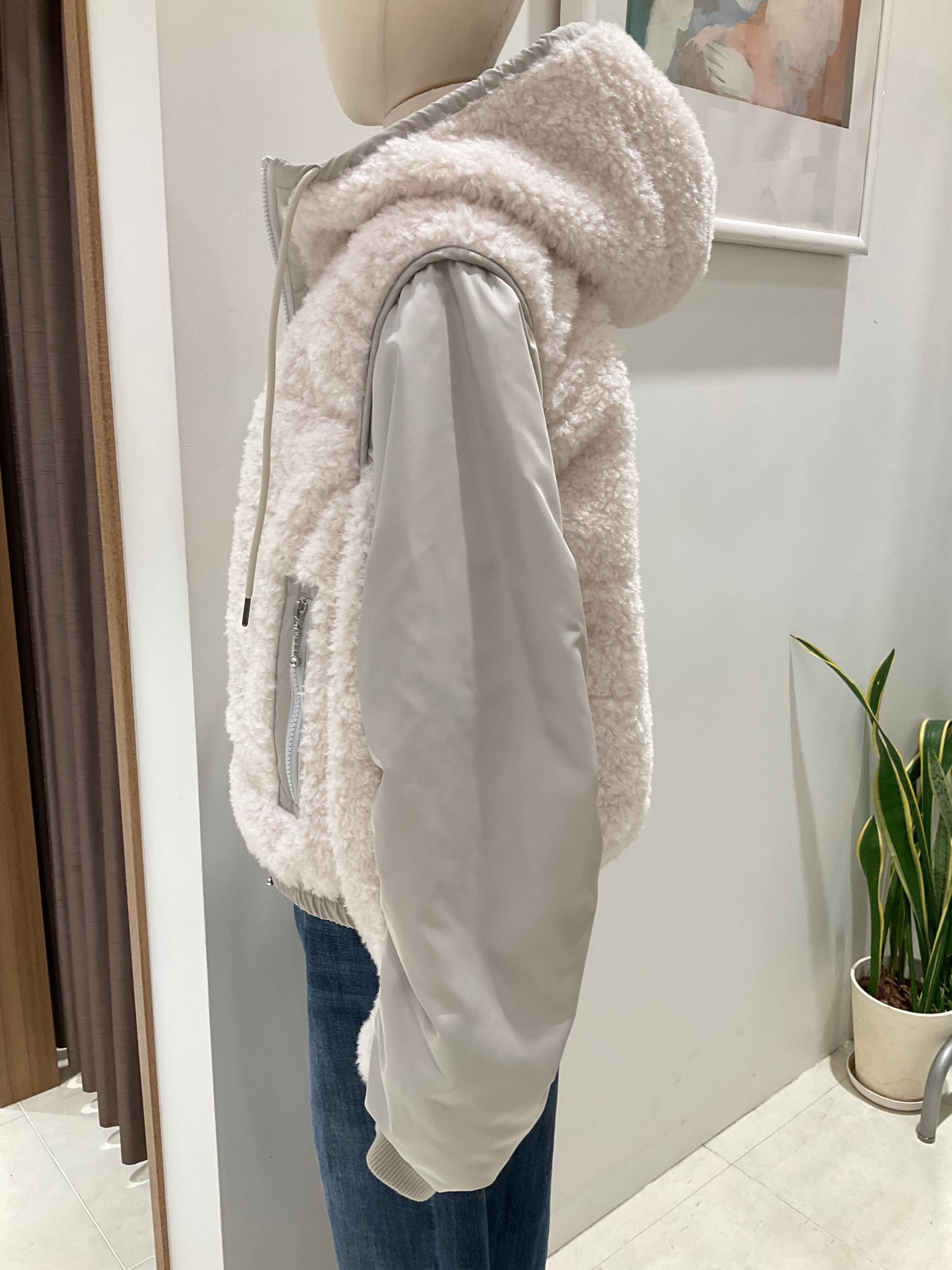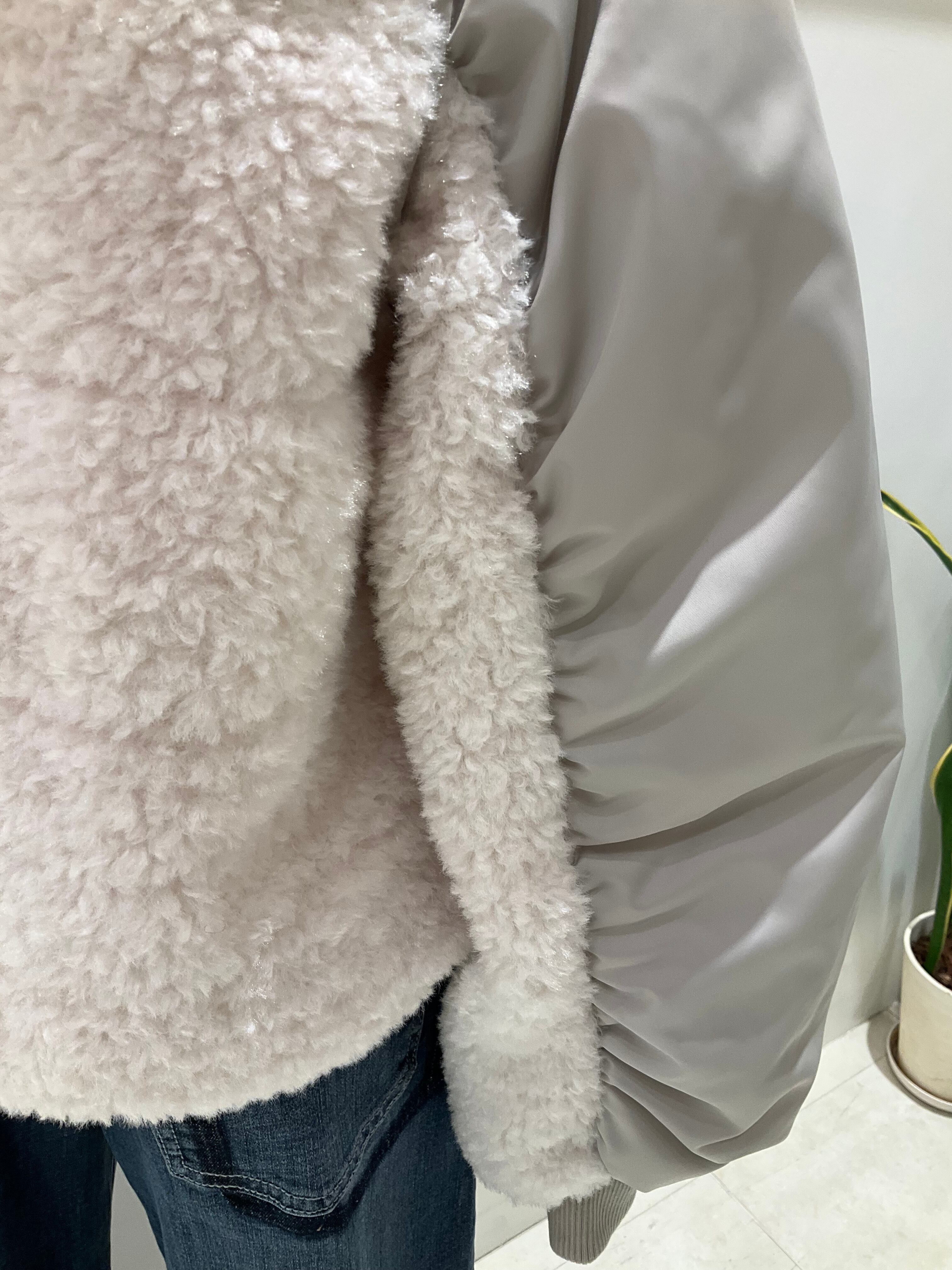 ふんわりとしたボア素材と軽やかなポリエステルのコンビネーションが絶妙なバランスを生み出しています!