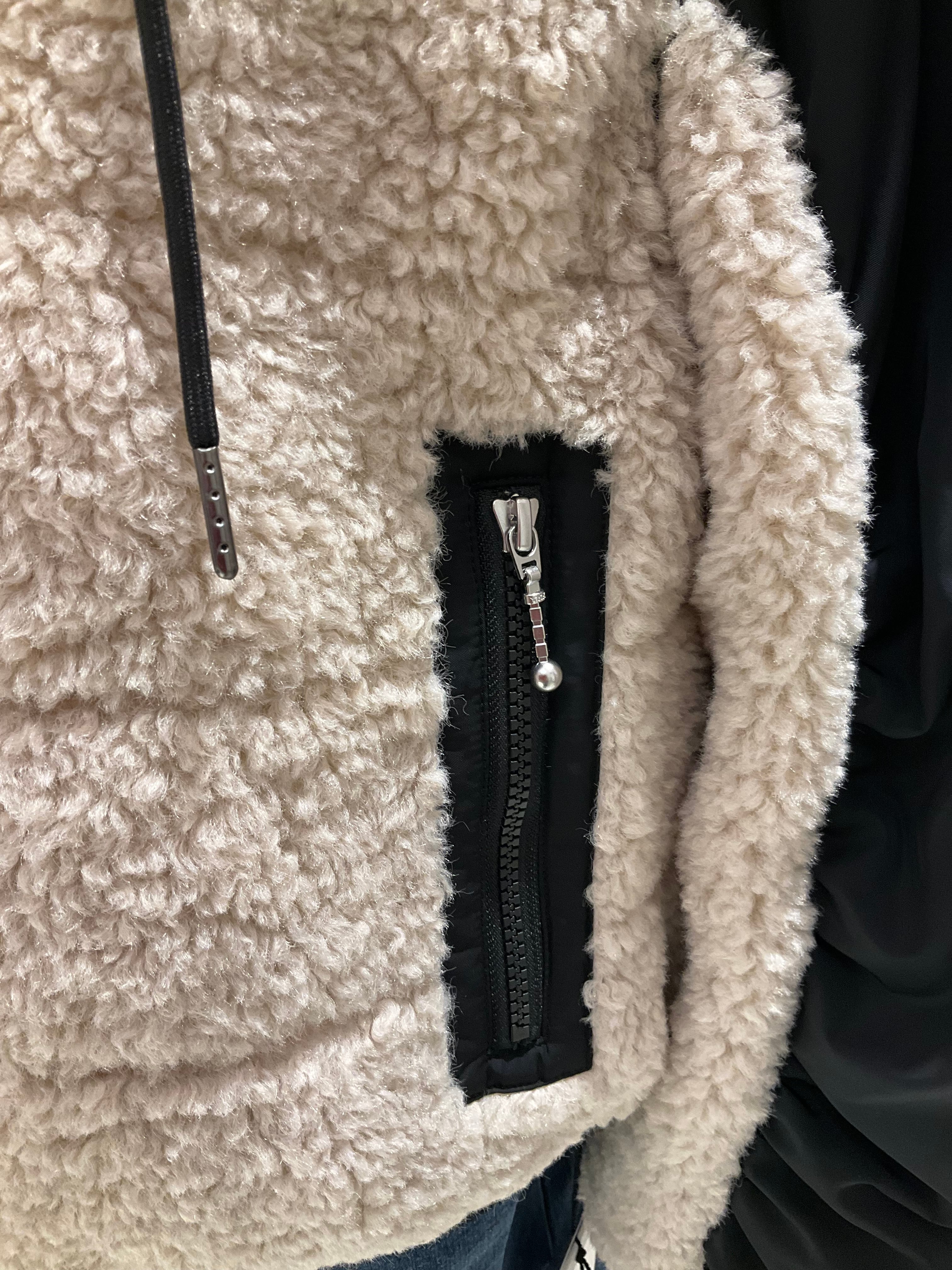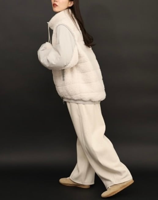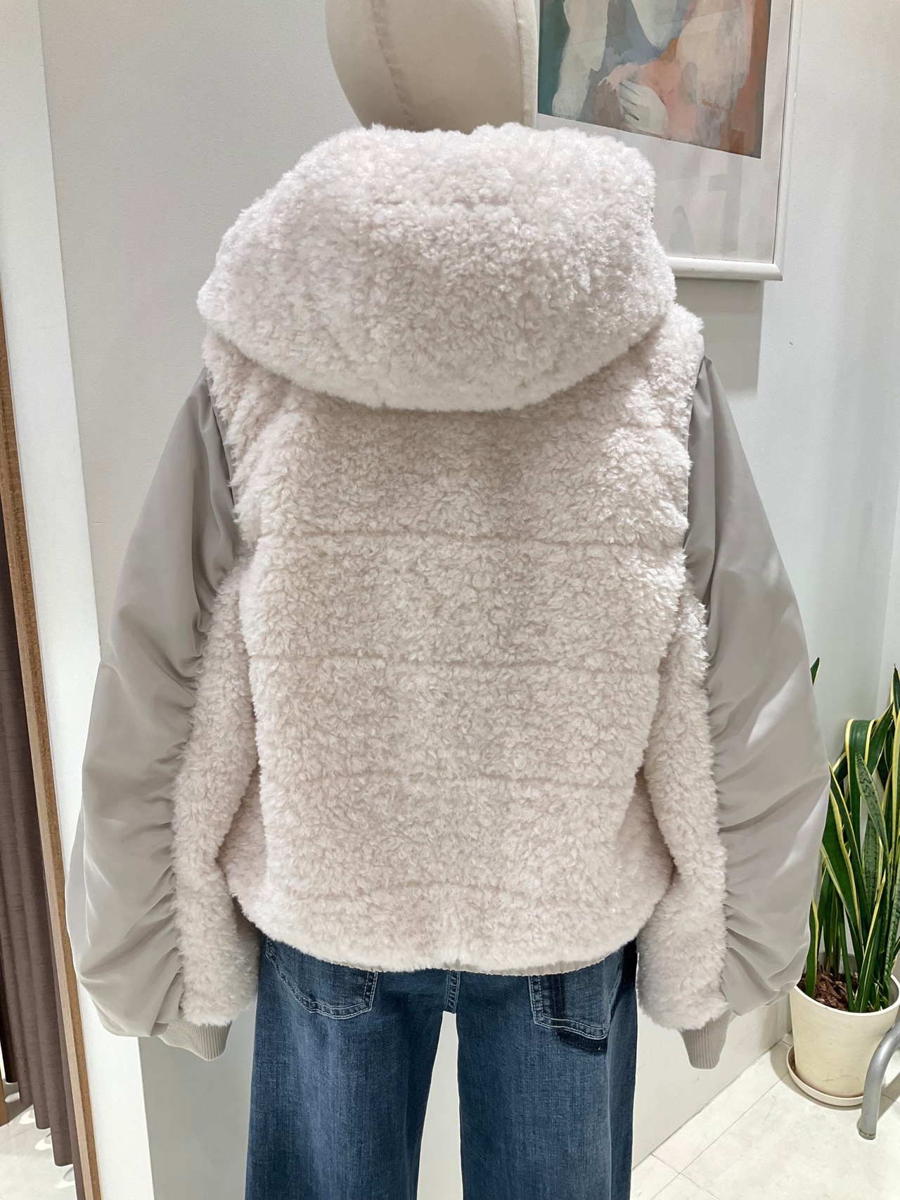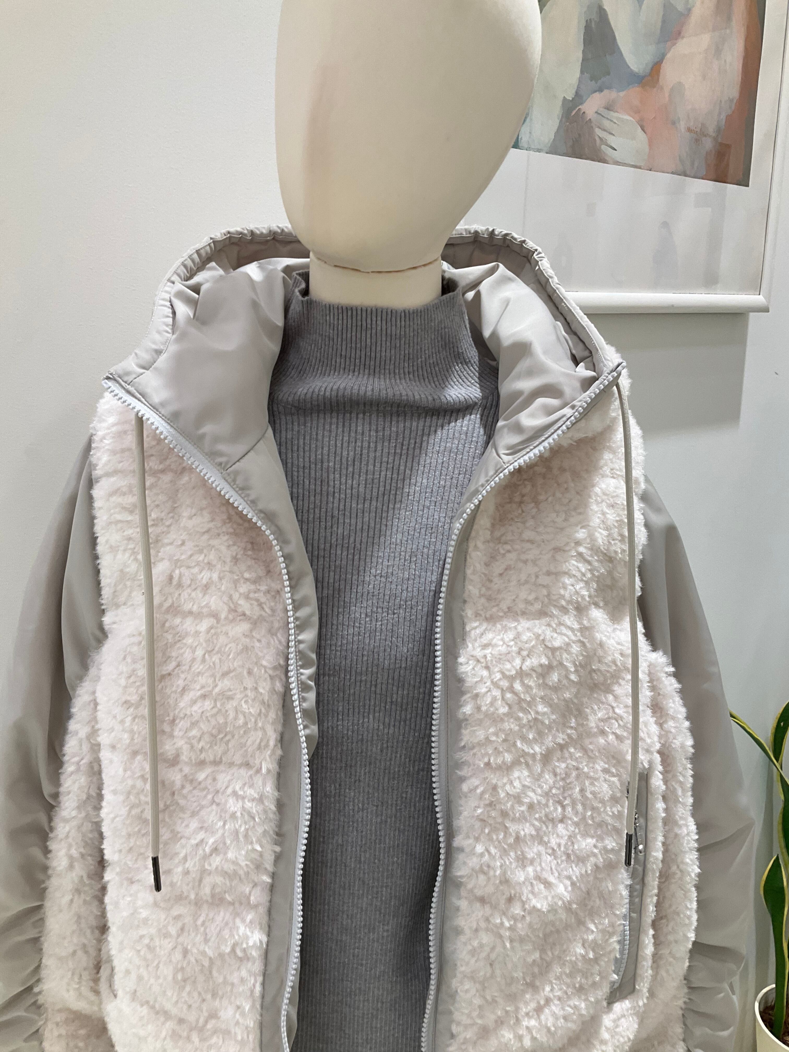 ふんわりとしたボア素材と軽やかなポリエステルのコンビネーションが絶妙なバランスを生み出しています!