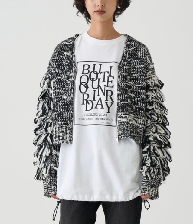 オーバーサイズロングスリーブTシャツの裾にスピンドルを通したリメイク風アイテム。