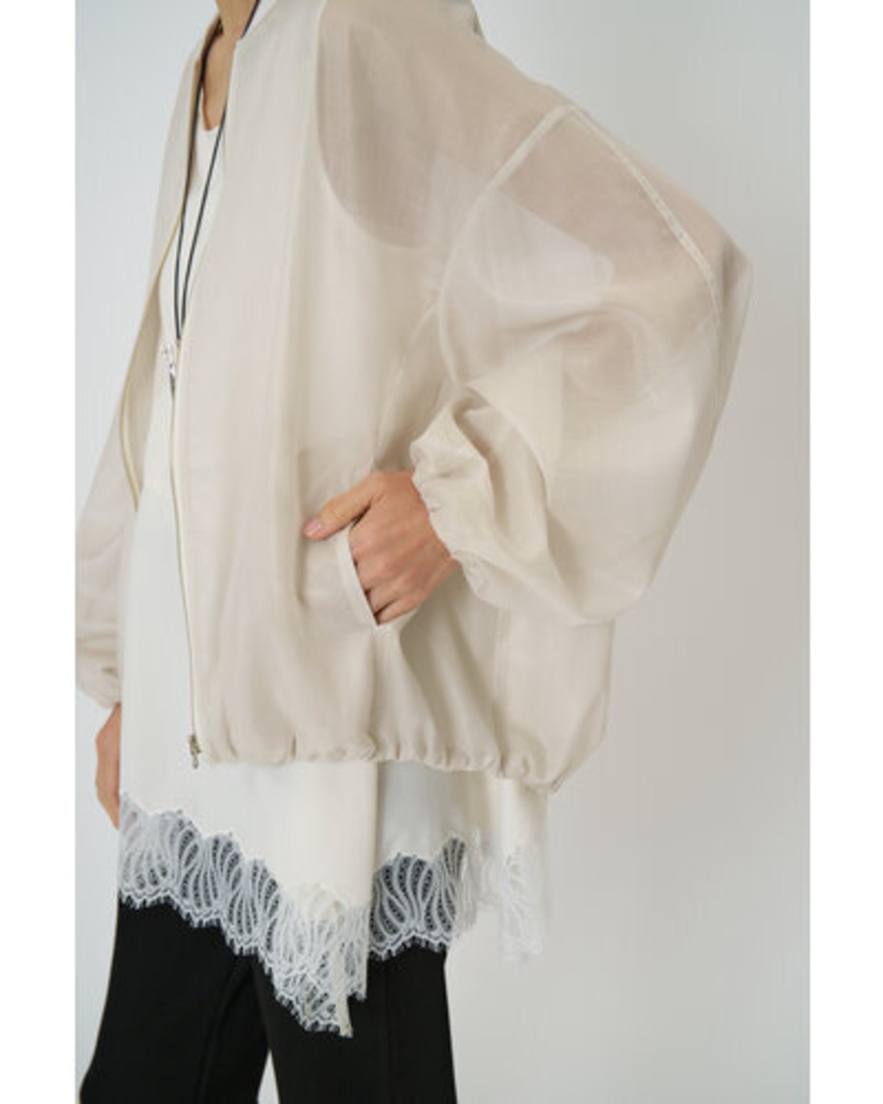 オーガンジー特有の繊細な透け感に光沢加工を施した、上品なツヤ感を持つ素材を使用しました。