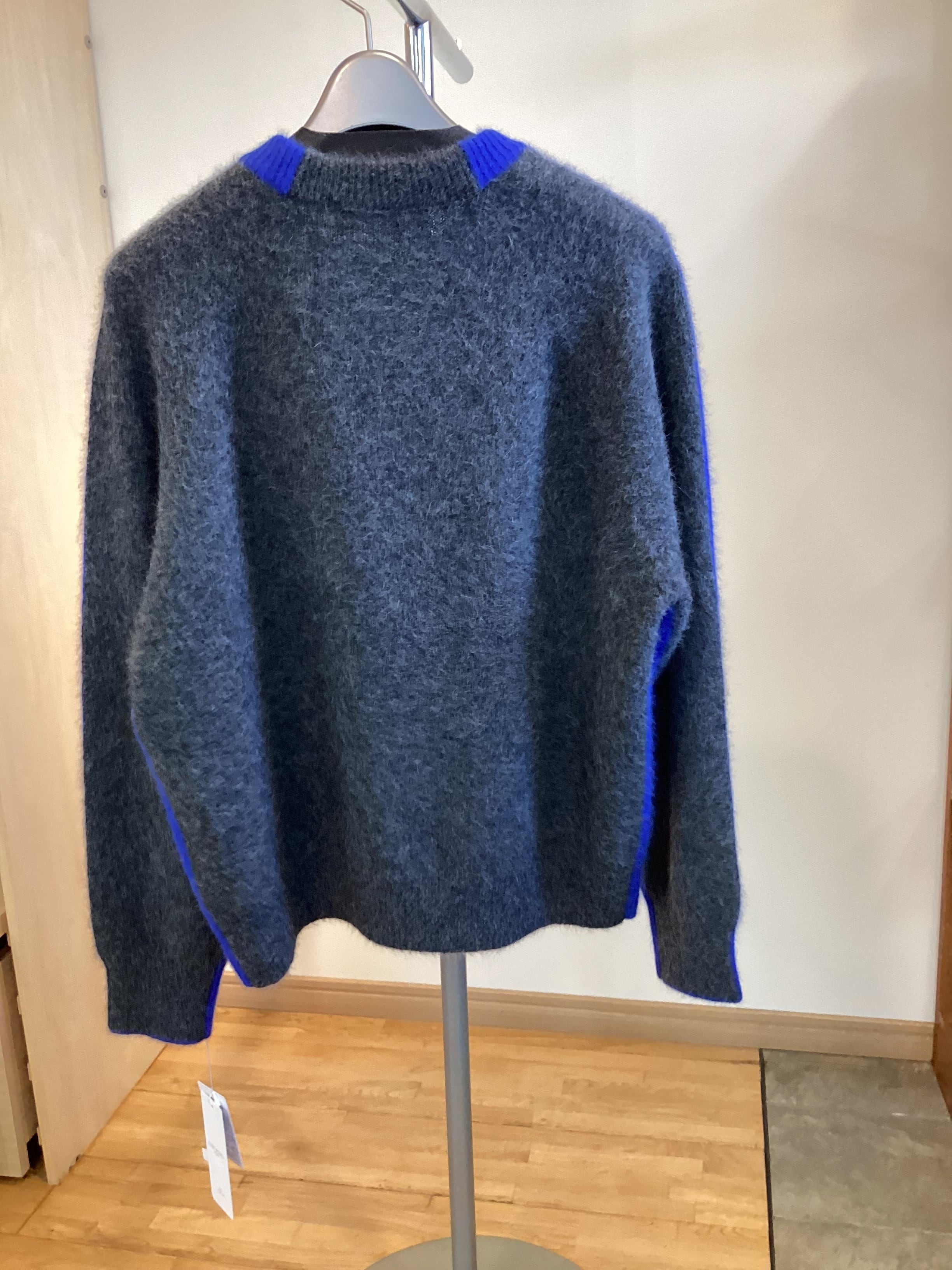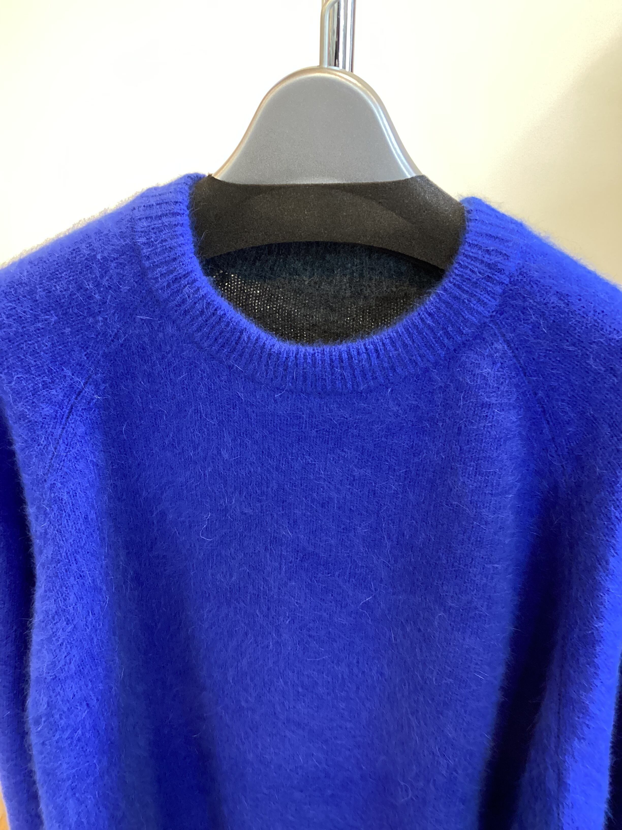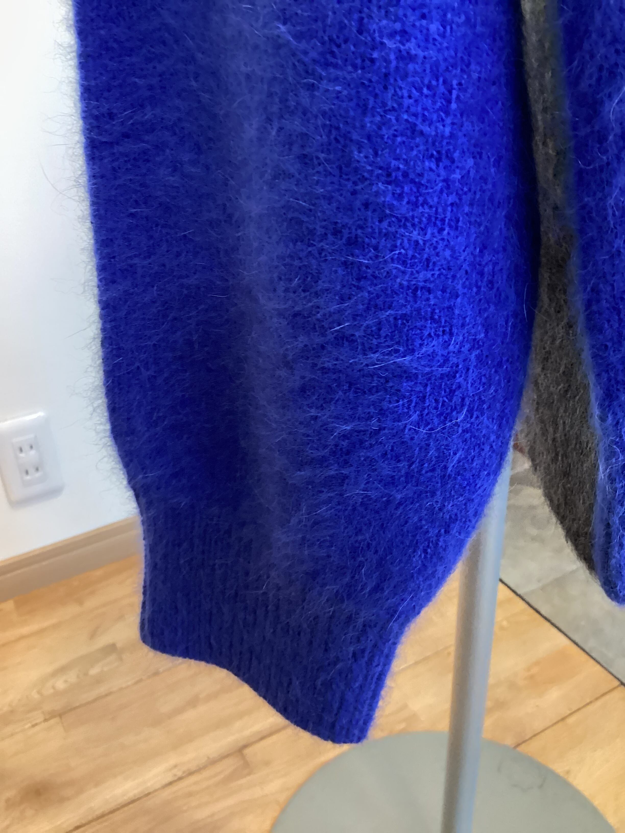 鮮やかなブルーとグレーの前後配色が特徴のニットです。フォックス60%とアルパカ40%の贅沢な素材を使用しており、柔らかく暖かい極上の肌触りが魅力です。カジュアルにもフォーマルにも合わせやすい一着です。