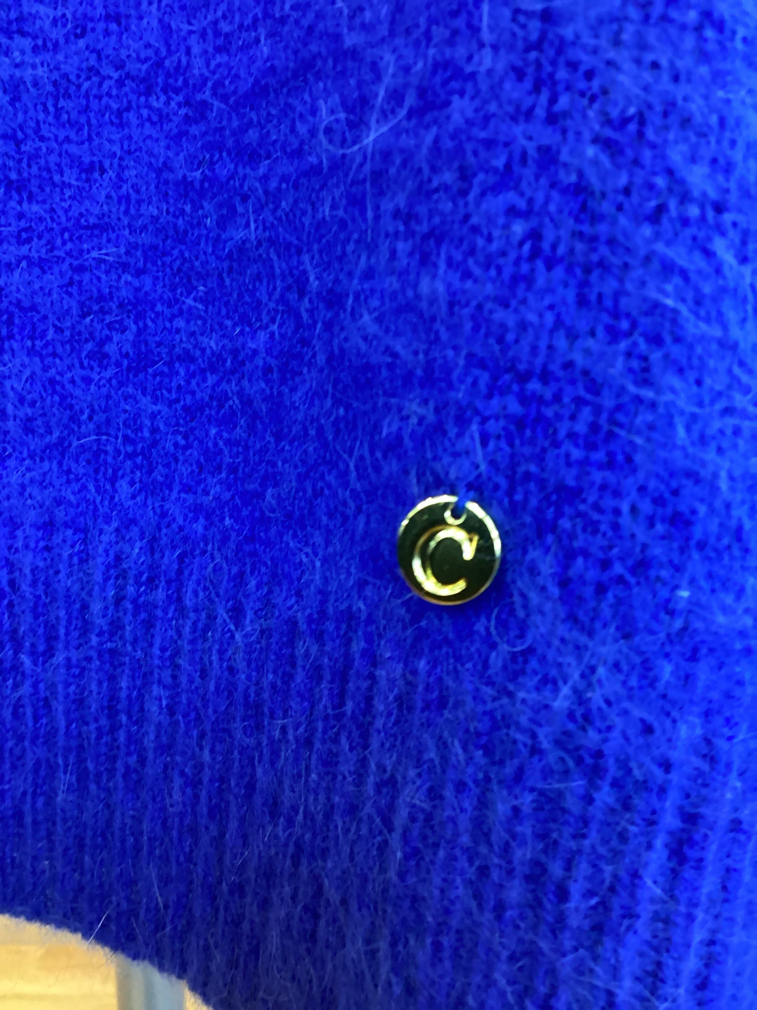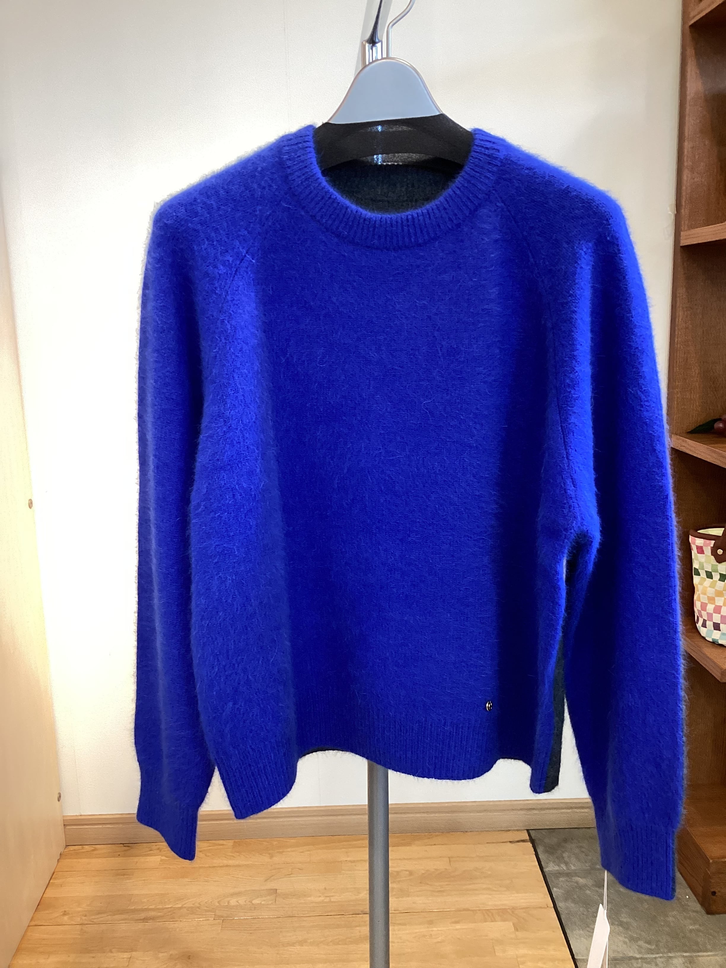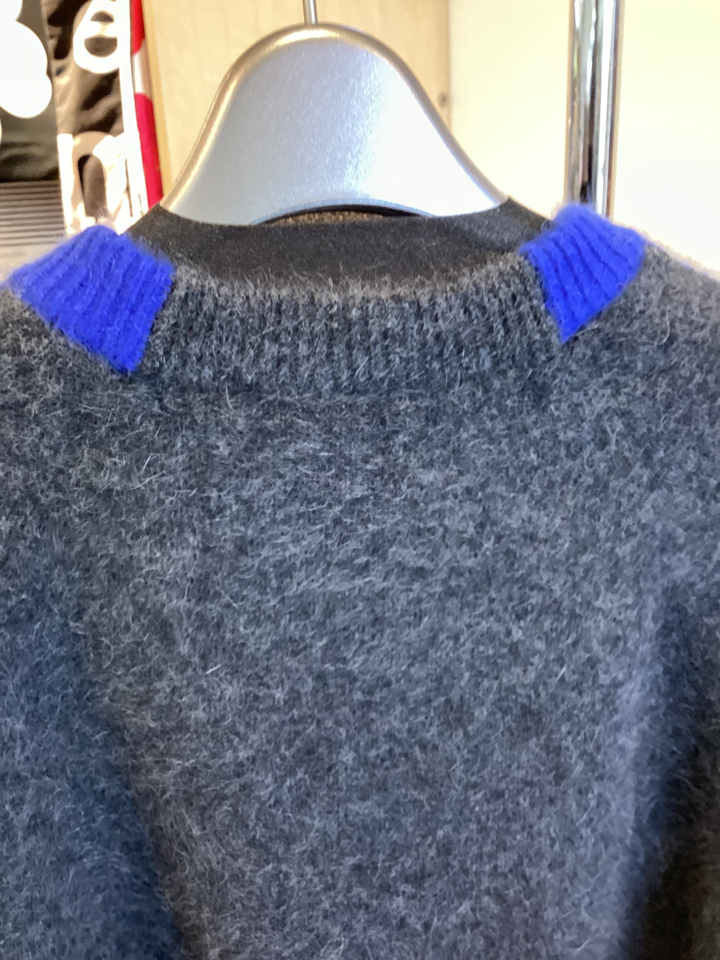 鮮やかなブルーとグレーの前後配色が特徴のニットです。フォックス60%とアルパカ40%の贅沢な素材を使用しており、柔らかく暖かい極上の肌触りが魅力です。カジュアルにもフォーマルにも合わせやすい一着です。