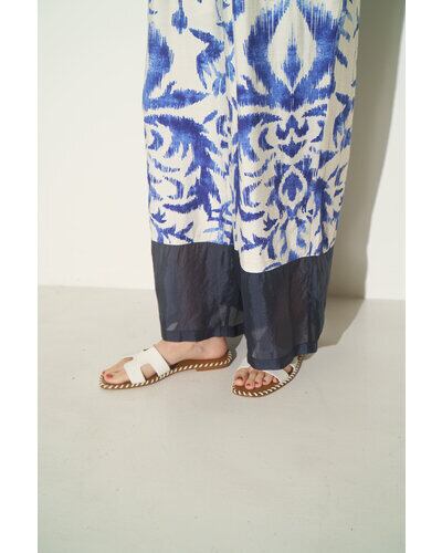 シンプルなワイドストレートシルエットで、裾のシアーオーガンジーで配色を効かせています。