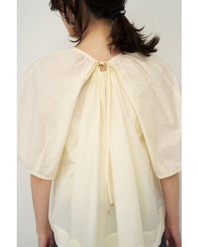 後衿ぐりのギャザー部分は自由に調整でき、ギャザーの寄せ方次第で、後の着丈や袖のボリュームなど、シルエットの変化を楽しめるデザインになっています。