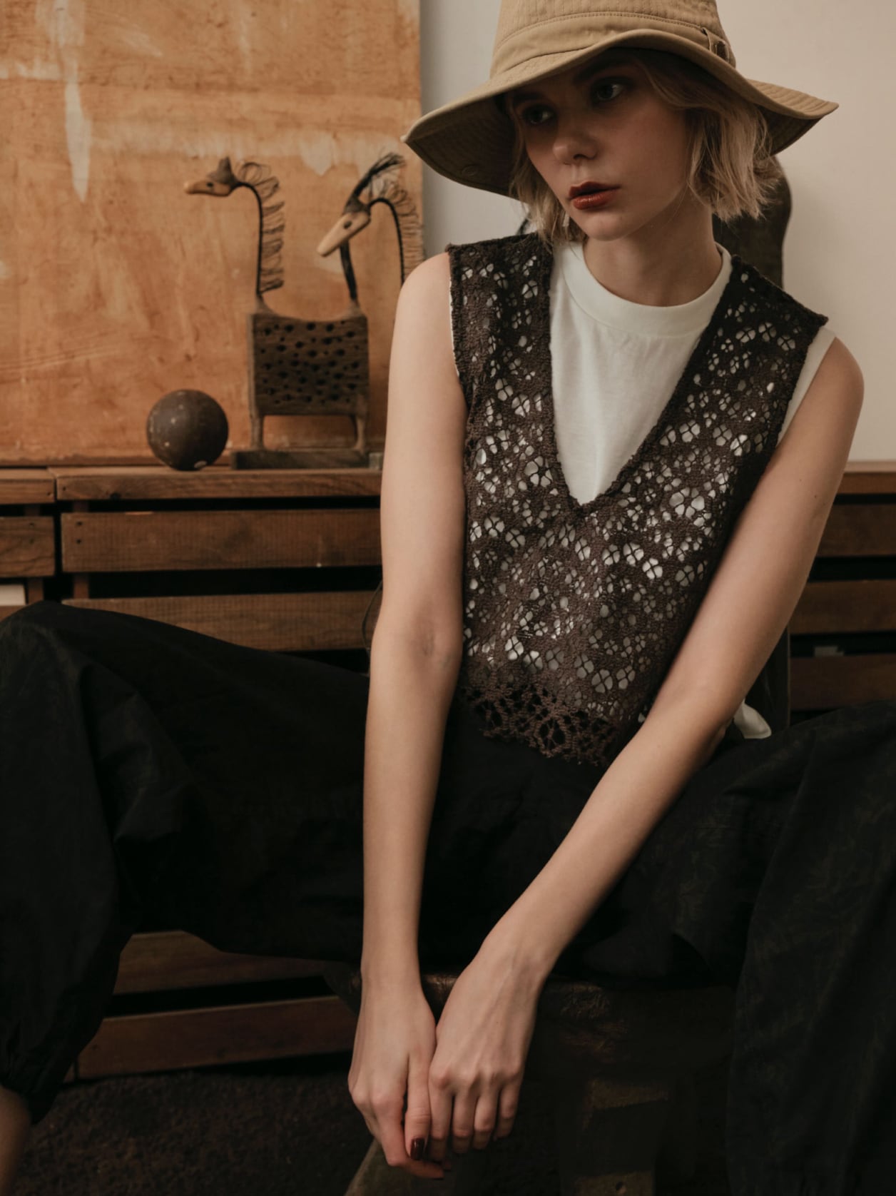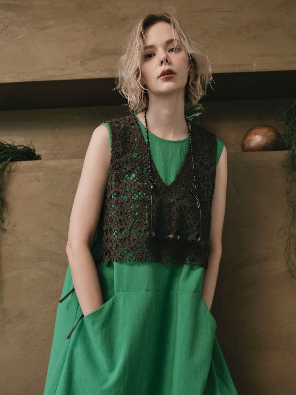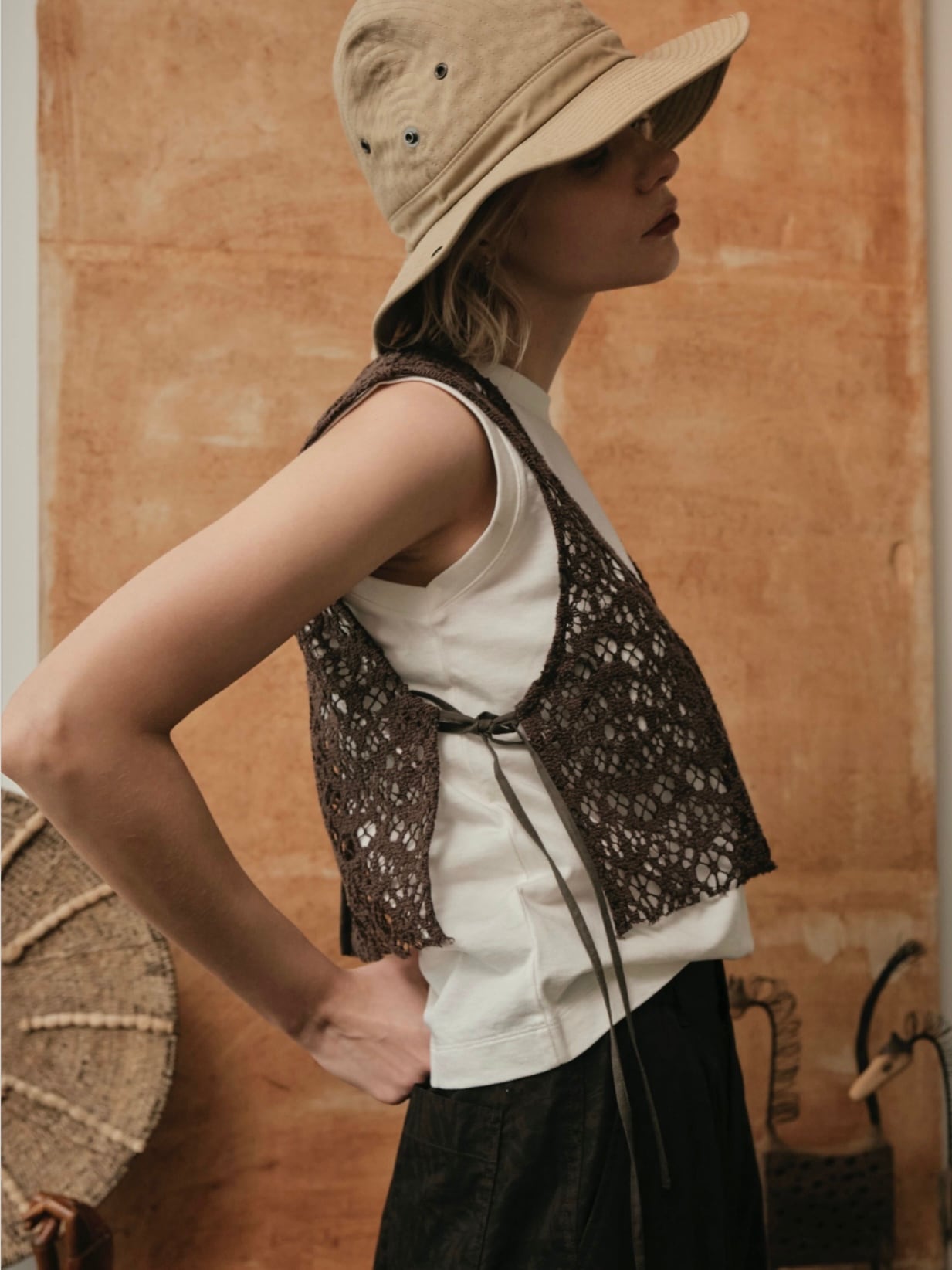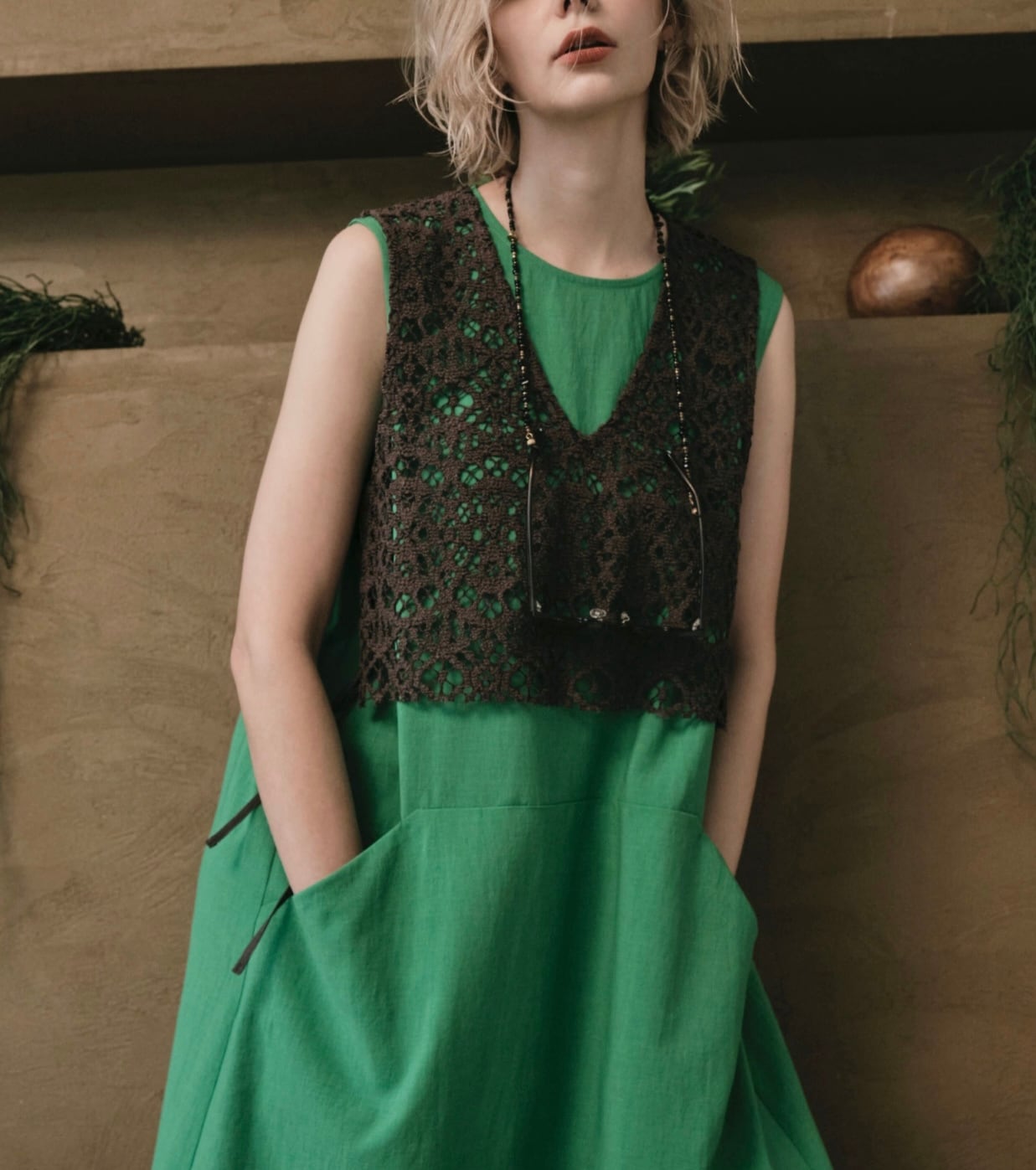 立体感のあるラッセルレースで、規則的な網目と幾何学モチーフが特徴。クラフト感があり、ケミカルレースのような見た目で華やかな印象。ゼッケン型のベスト。
