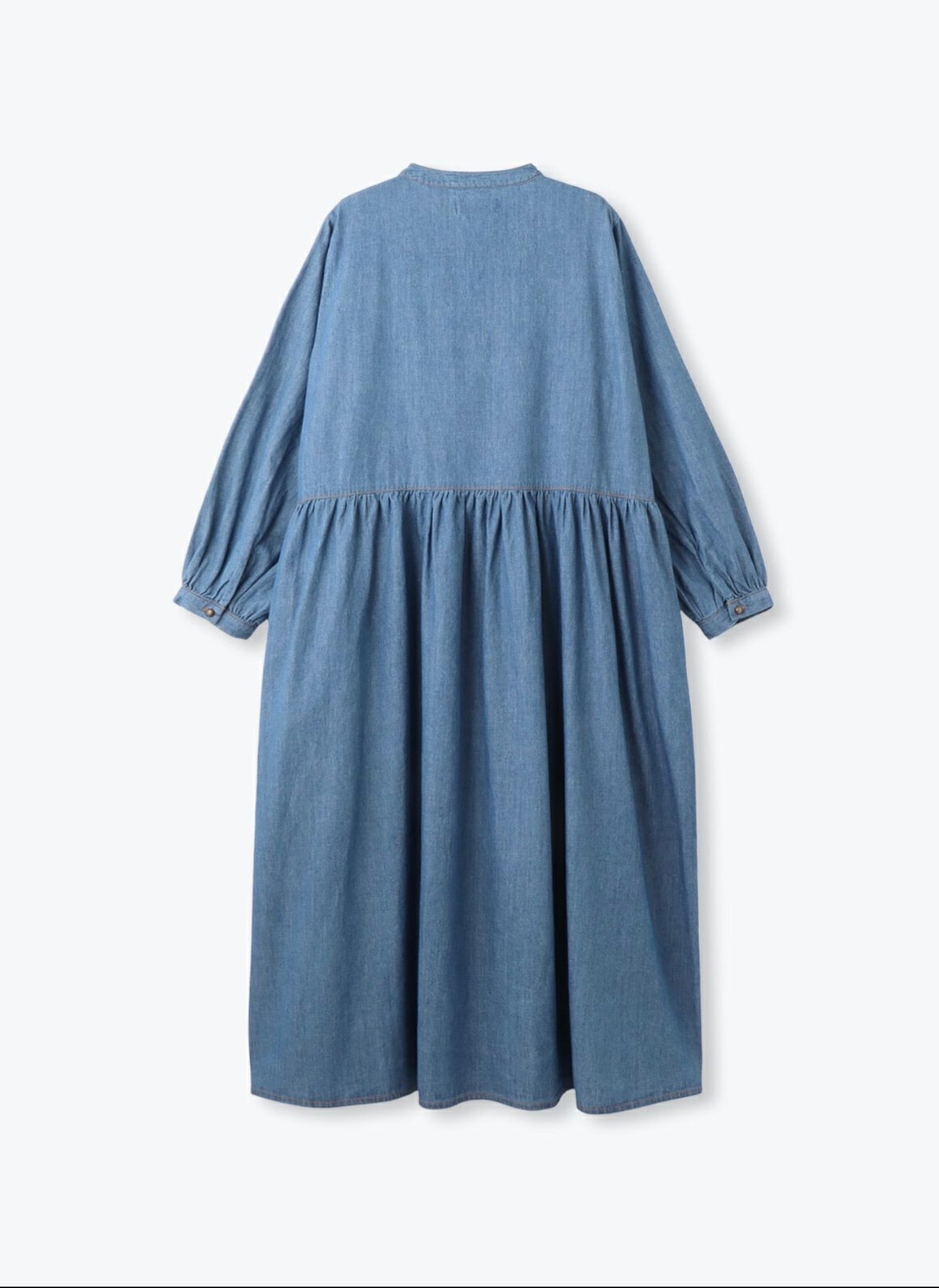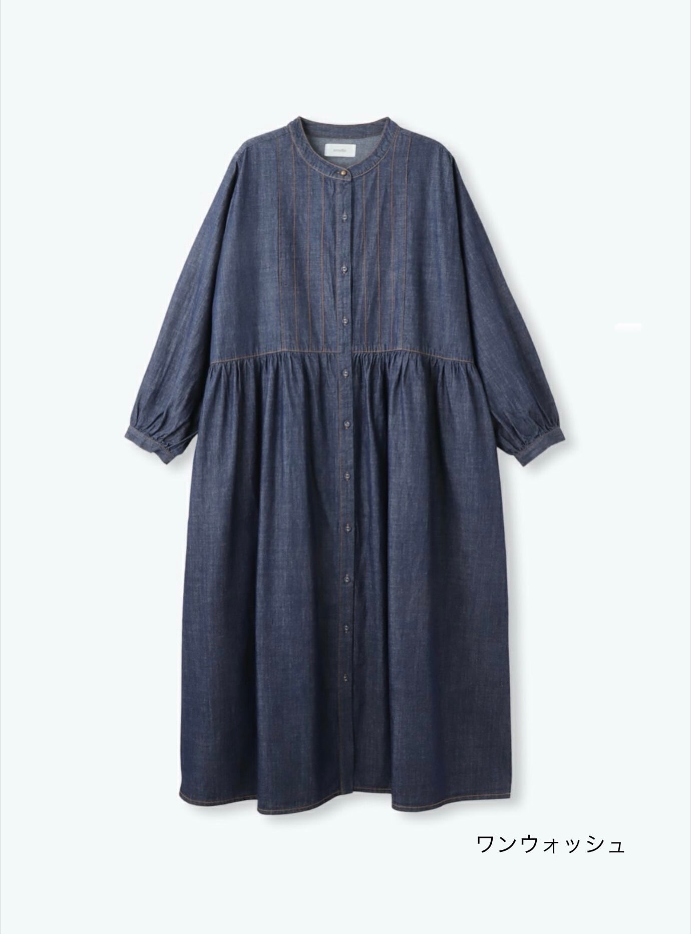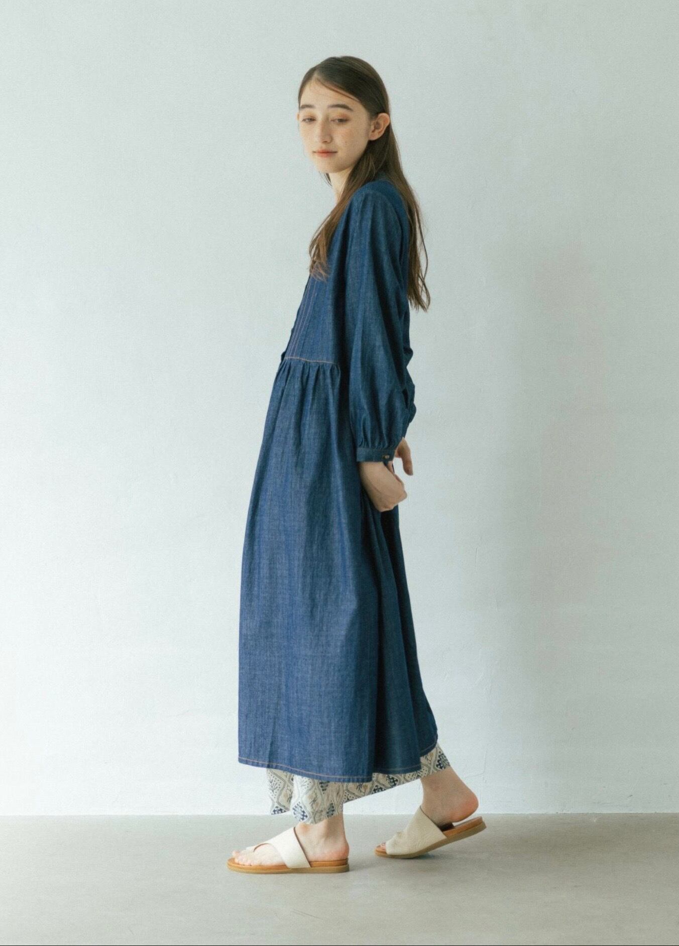 たっぷりの生地を使ったギャザーワンピース。 ライトオンスのデニムならではのウエスト切替ギャザーからの