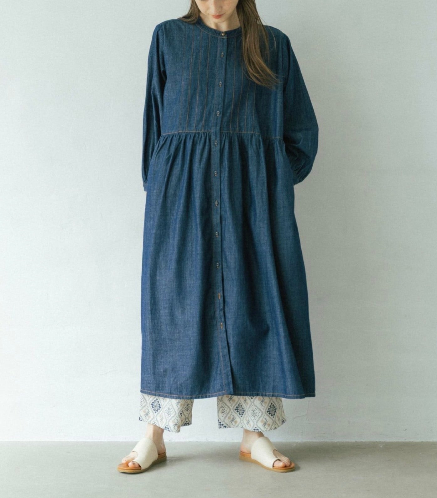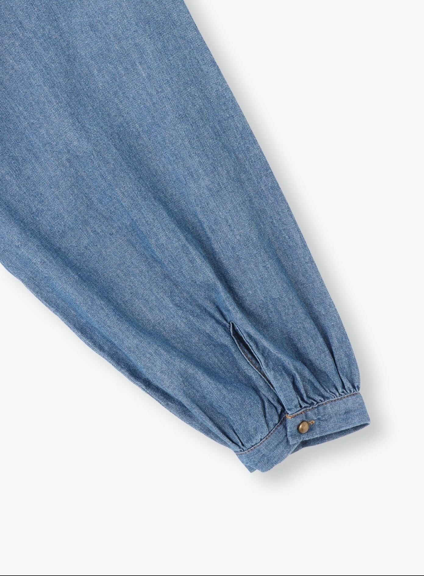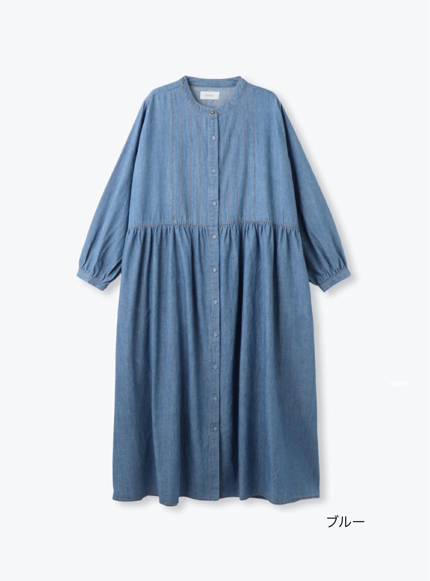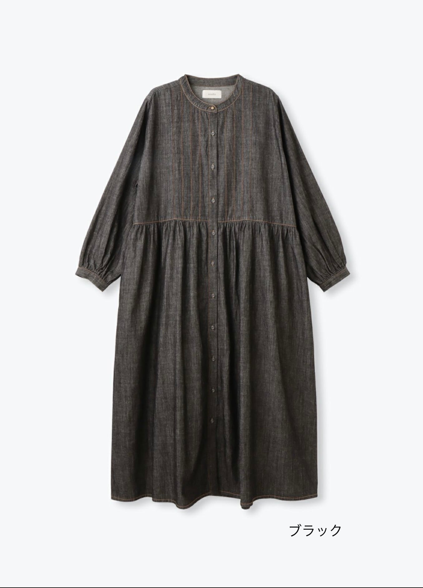 たっぷりの生地を使ったギャザーワンピース。 ライトオンスのデニムならではのウエスト切替ギャザーからの