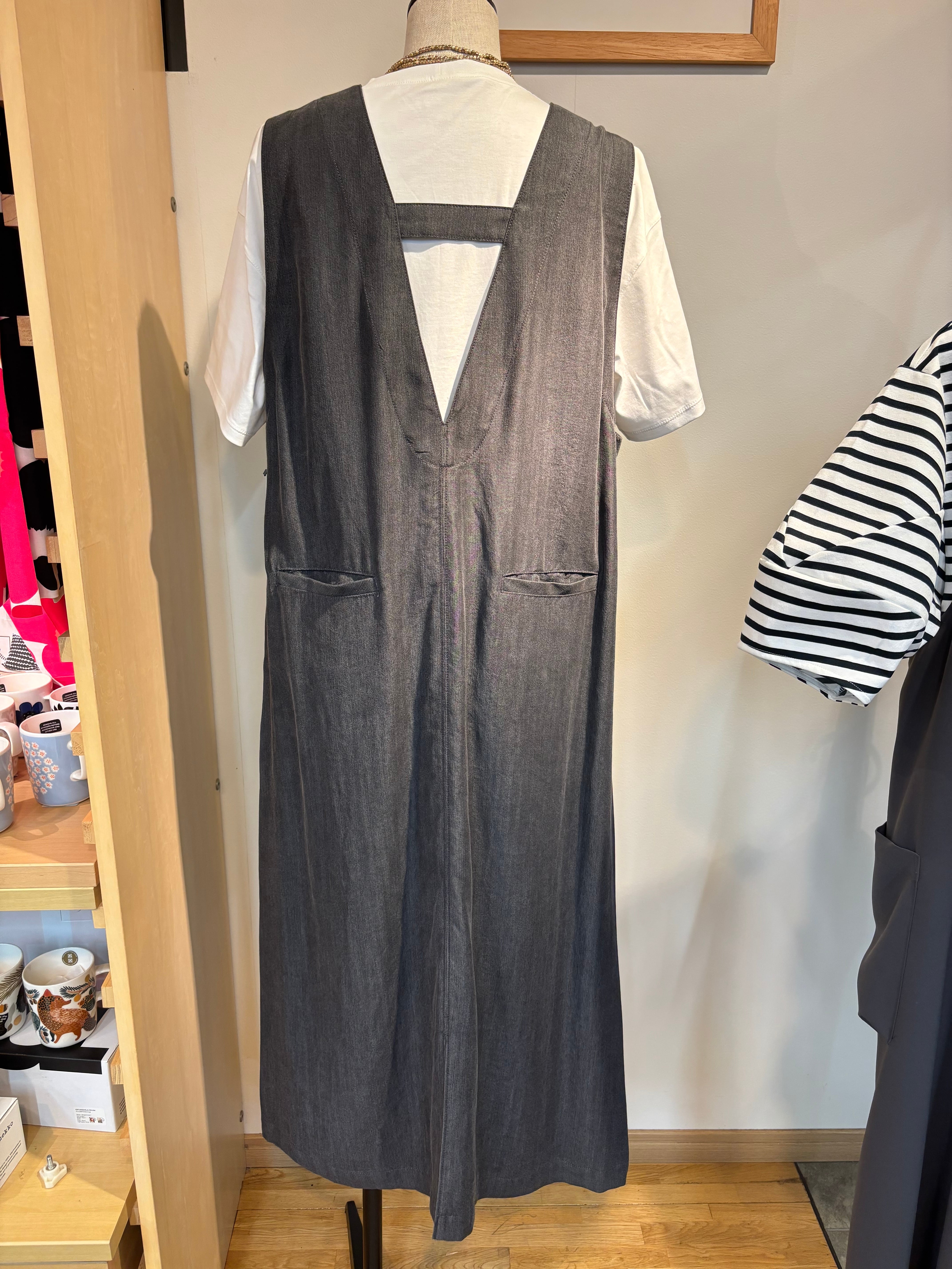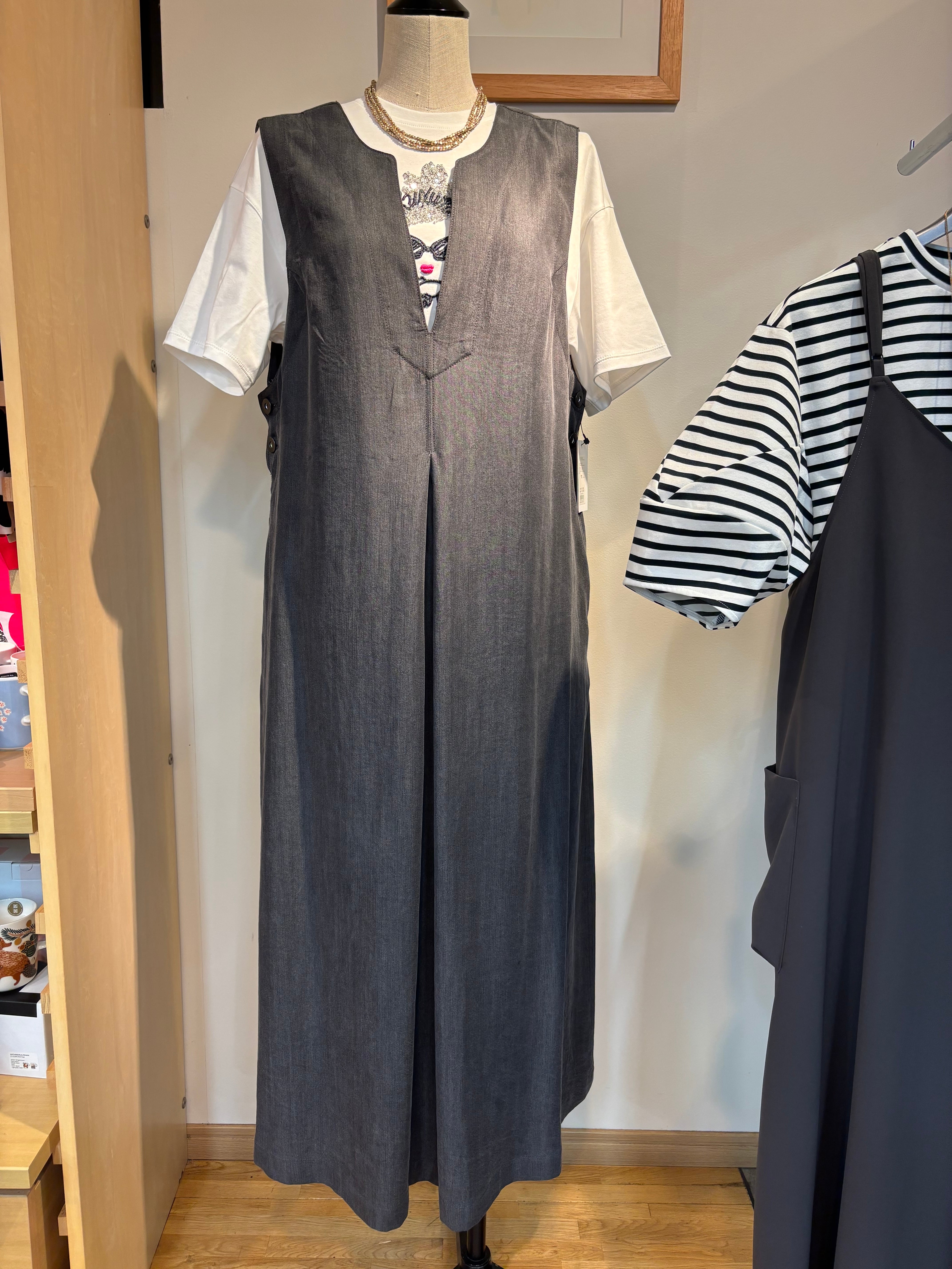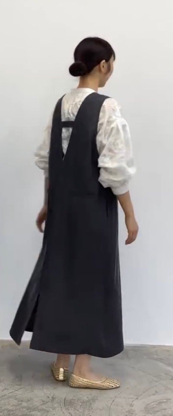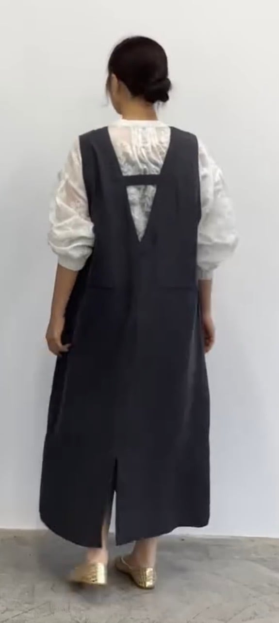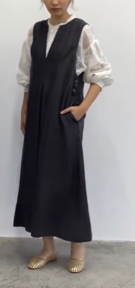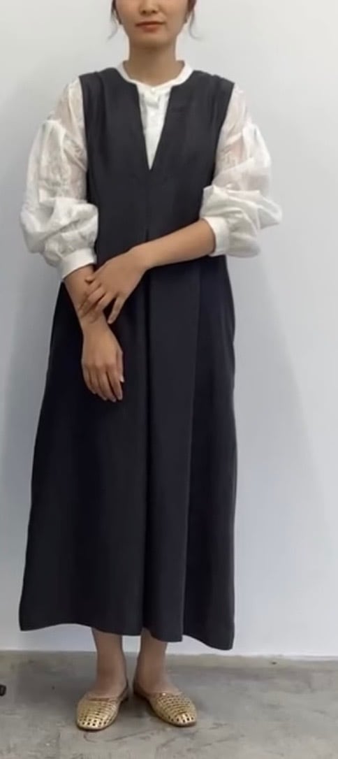 サロペットのように見えるジャンパースカート。深Vで落ち感のある素材でスッキリ見えします!レイヤードスタイルも楽しめ、大活躍してくれます!