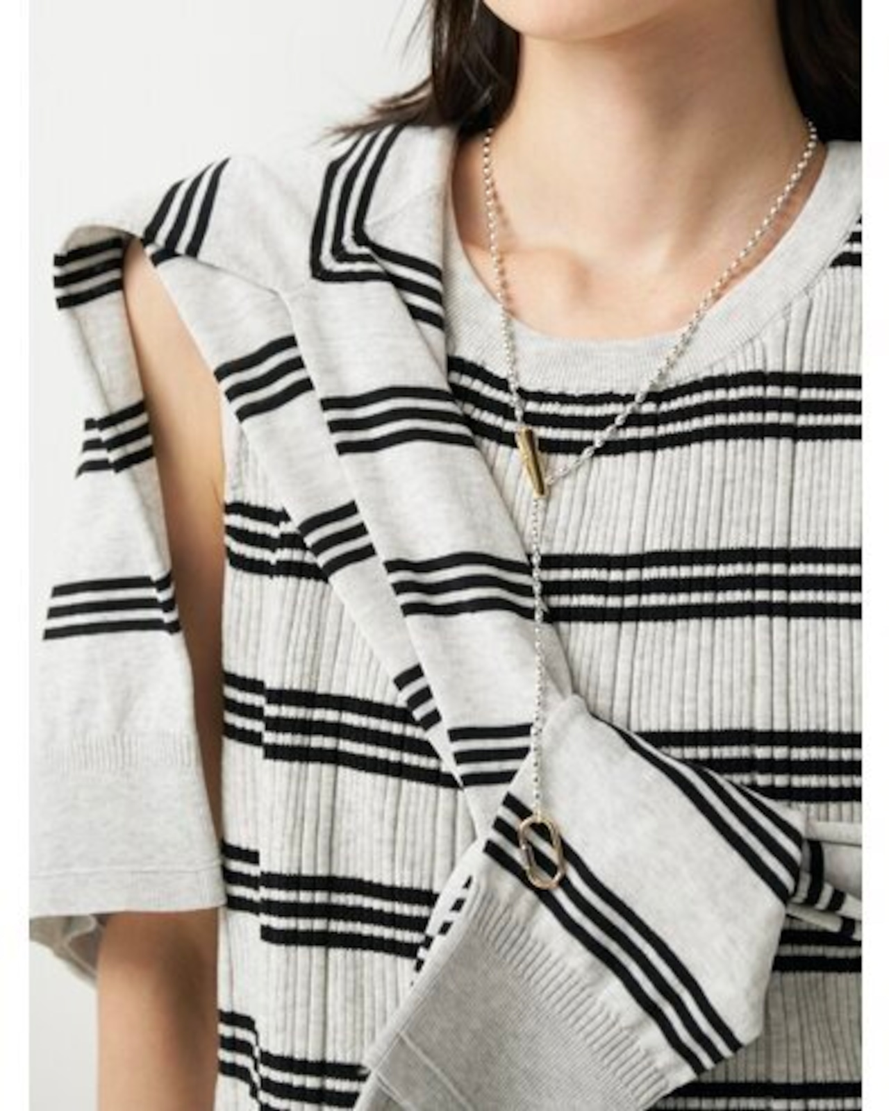 リズミカルな細ピッチボーダー2色は、スタイリングのアクセントにもおすすめ。