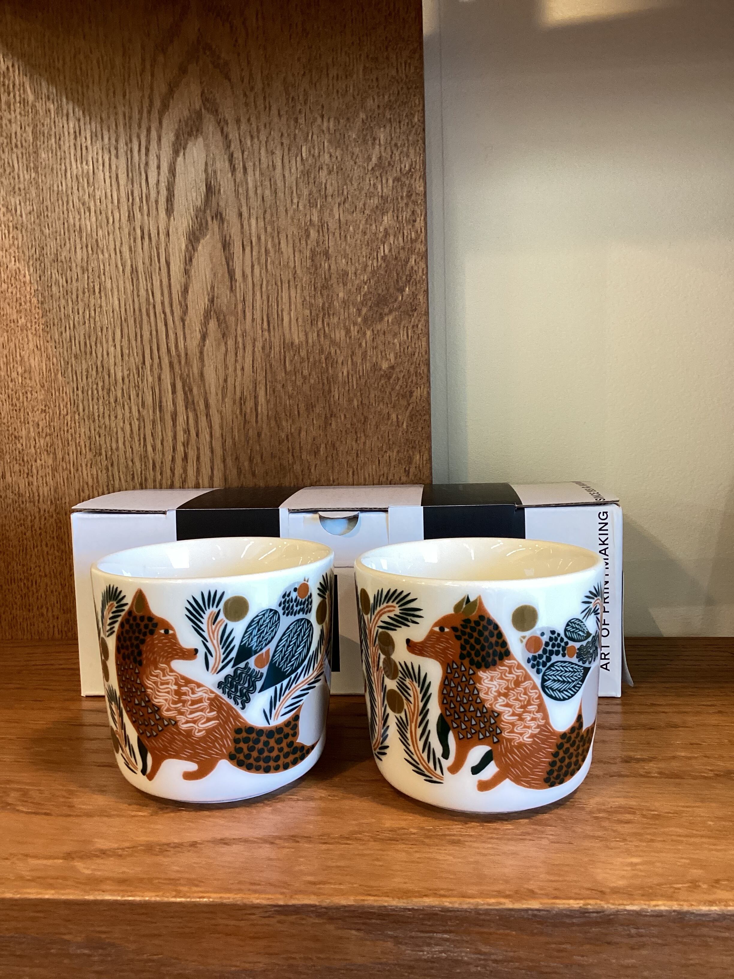 イチイの木に留まる小鳥たち、そこへ向かって忍び寄るキツネの姿を描いたKetunmarja(ケトゥンマルヤ)柄のコーヒーカップセット。取っ手のないシンプルなデザインに、手のひらに収まるコンパクトなサイズ感。電子レンジや食洗機にも対応しており、機能面でも使いやすさにこだわっています。